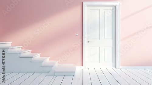 © khuraikah, Obraz premium White stairs and a white door in a light pink room.