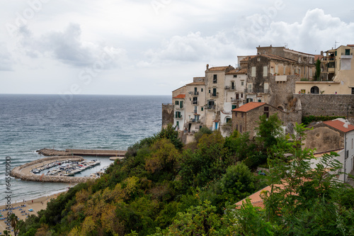 © barmalini, Obraz premium White stairs and old houses in medieval small touristic coastal town Sperlonga, Latina, Italy on sunrise in summer