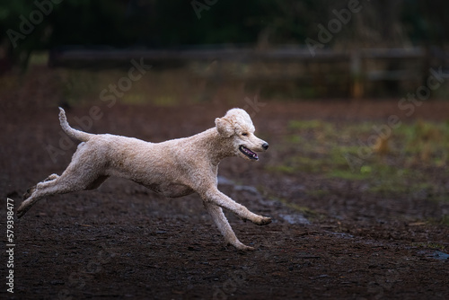 © Michael J Magee, Fototapeta premium 2023-02-19 WHITE STANDARD POODLE RUNNING AT MARYMOOR PARK IN REDMOND WASHINGTON