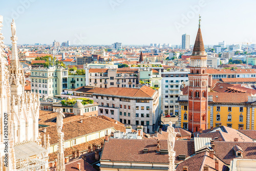 Fototapeta premium White statue on top of Duomo cathedral and view to city of Milan