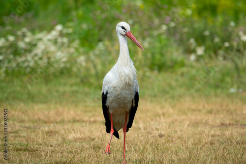 Fototapeta premium White stork bird (Ciconia ciconia)walking in background of meadow with green grass and flowers.