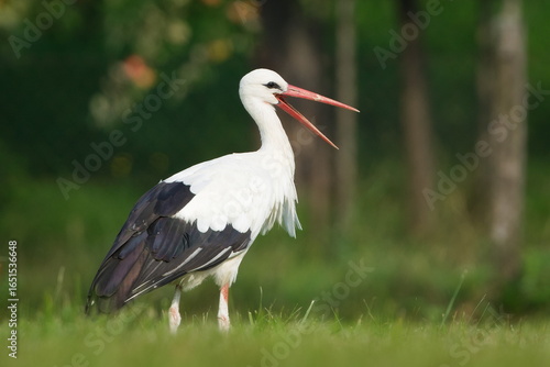 © czjonyyy, Fototapeta premium White stork (Ciconia ciconia) calling with visible tongue on meadow. Open beak. Nature of Czech republic.