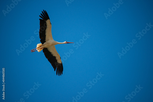 © Majopez, Obraz premium White stork (Ciconia ciconia) flying with spread wings to the right