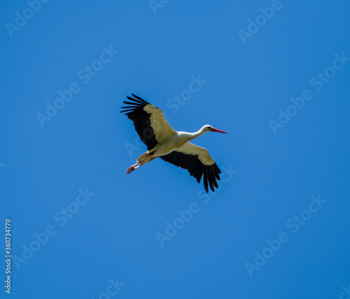 © Tobias, Naklejka premium White stork (Ciconia ciconia) flying with spread wings with a tree and the blue sky in the background