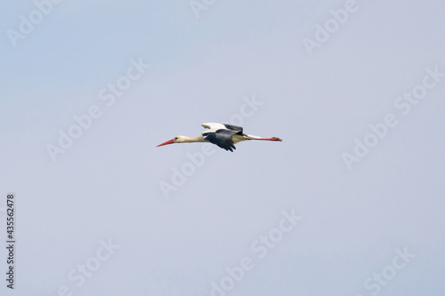 Obraz premium White stork flies against a blue sky with white clouds. Red beak and orange...