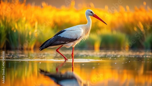 © methinee, Fototapeta premium White stork hunting in shallow waters at sunset