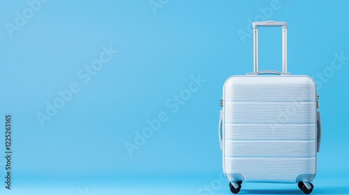 © BROPRADANA, Obraz premium White suitcase on blue background, travel preparation