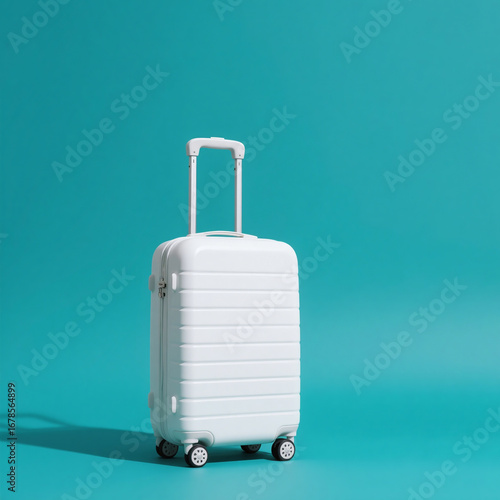 © wowyoung, Obraz premium White Suitcase with Telescopic Handle on Solid Teal Background