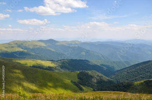 © Dmytro, Fototapeta premium White summer clouds overt the mountains covered green forest and grassy slopes Borzhava mountain range, popular travel destination of Ukraine. Carpathian Mountains
