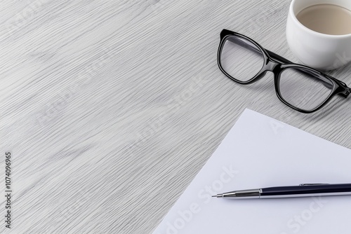 Fototapeta premium White Surface with Pen, Glasses, and Paper