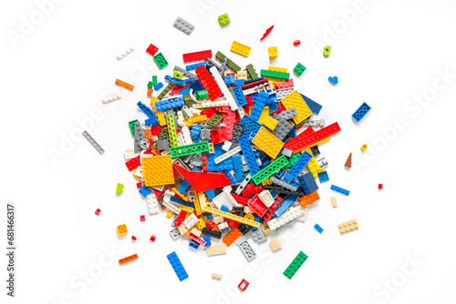 © Iana Alter, Obraz premium White Surface with Various Building Toys: Creative Construction Play. Lego blocks. Novosibirsk, Russia - October 26, 2023.