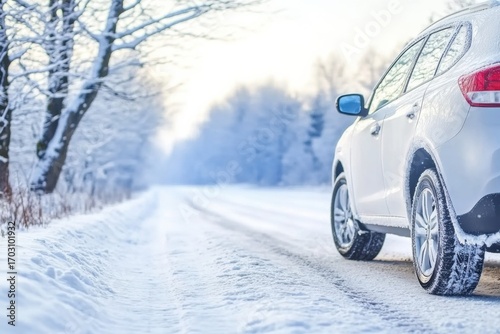 © Panuwat, Naklejka premium White SUV car driving snowy road is facing landscape in the winter