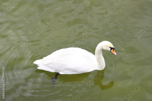 © far700, Fototapeta premium White swan floating on a pond. Close-up. Background.