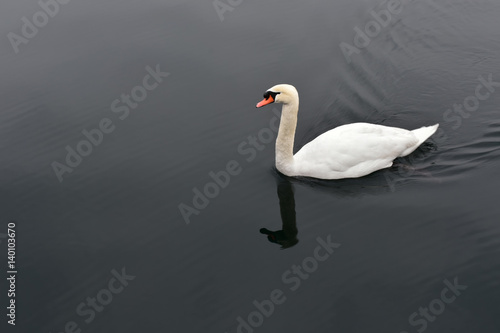 Fototapeta premium White swan in calm black water