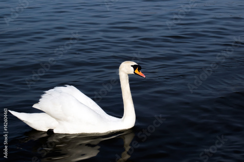 © gpetric, Naklejka premium White swan in the foggy lake at the dawn. Morning lights. Romantic background.