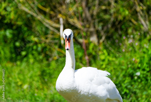 © Elly Miller, Obraz premium White swan on a green grass. Cygnus.