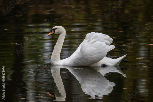 © константин константи, Naklejka premium white swan on green water on an autumn day