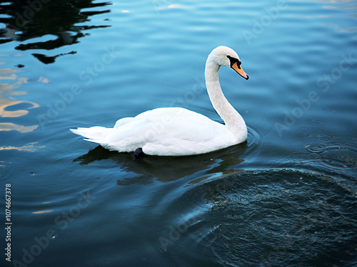 © Larysa, Fototapeta premium white swan on the surface of blue water, circles on the water and reflections