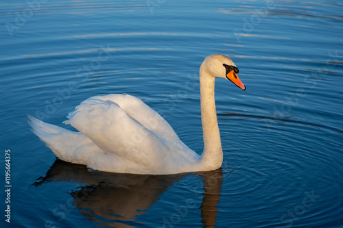 © mikhailgrytsiv, Naklejka premium White swan onlake shore. Swan on beach. Swan on shore