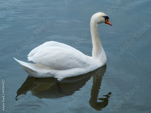 Fototapeta premium White swan swimming on lake, symmetrical reflections in blue water