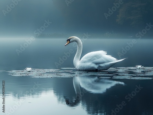 © Ali, Obraz premium White swan swims on calm water surface with reflection in dark moody atmosphere.