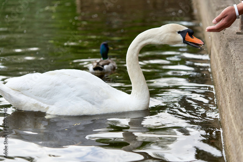 © A, Obraz premium White swan with a long neck and a red beak eats food from hands