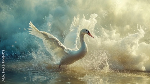 © musa, Fototapeta premium White swan with wings spread emerges from a wave of water.