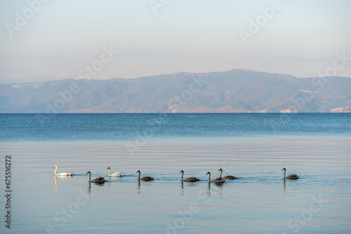 Naklejka premium White swans, cygnus parents with their children juveniles six brown swans cygnets. Teaching how to swim. Concept. Family together. Ohrid lake,Macedonia summer 2023.