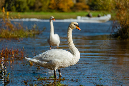© Nataliya Schmidt, Fototapeta premium White swans in the fall on the shore of the reservoir.