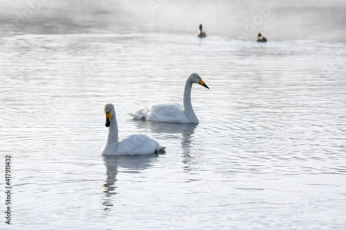 © gumbao, Fototapeta premium White swans swimming in the nonfreezing winter lake