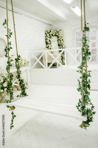 © Александр Кудрявцев, Naklejka premium White swing with artificial flowers