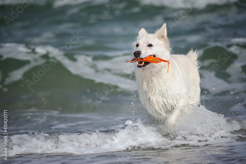 © AnetaPics, Fototapeta premium White Swiss Shepherd on the ocean in holiday