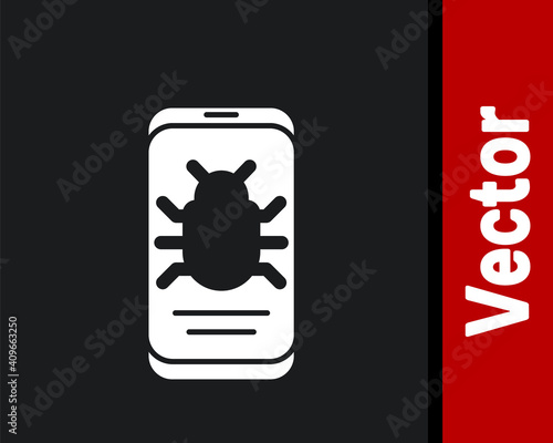 Obraz premium White System bug on mobile icon isolated on black background. Code bug concept. Bug in the system. Bug searching. Vector.