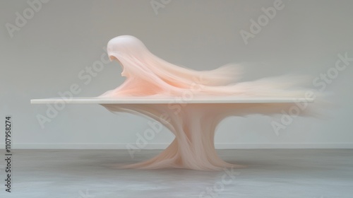 © Interiors and Design, Obraz premium White table with a unique design. the table is in an empty room with a concrete floor and a plain white wall in the background.