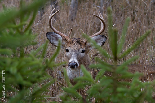 © Jim Cumming, Fototapeta premium White-tailed deer buck closeup behind pine trees in Ottawa, Canada