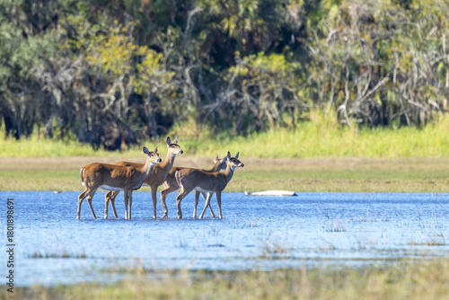 Naklejka premium White-tailed deer (Odocoileus virginianus) walking in the water in Myakka...