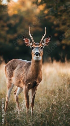 © atar, Naklejka premium White tailed deer standing in a field of tall grass with antlers and big ears