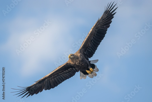 Obraz premium White tailed eagle flying with the sky in the background, close up