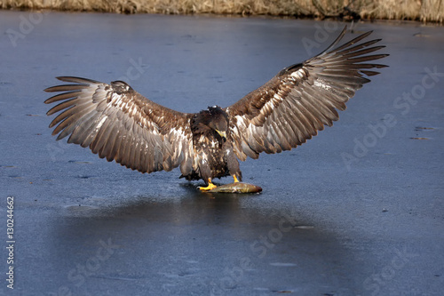 © Karlos Lomsky, Fototapeta premium White-tailed eagle (Haliaeetus albicilla) are also known as sea eagle, with fish on ice, falconery