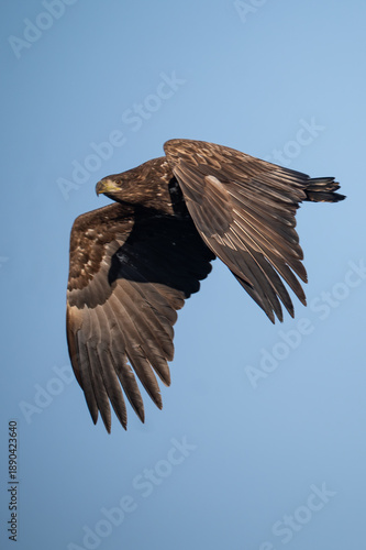 Obraz premium White-tailed Eagle (Haliaeetus albicilla) soaring in a clear blue sky.