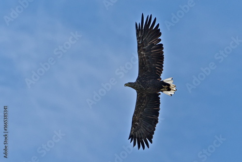 Fototapeta premium White-tailed eagle (Haliaeetus albicilla) soaring in clear blue sky, uncommon...