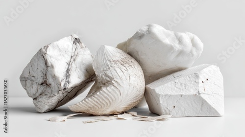 © Juan, Obraz premium White textured rocks and seashells arranged on surface for natural mineral product branding photography composition background