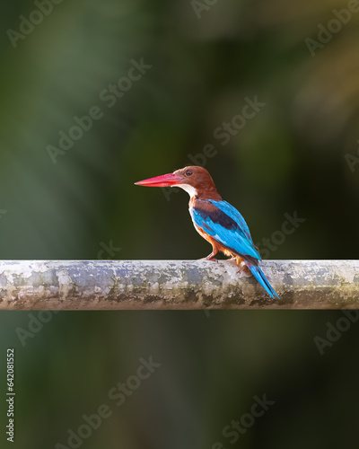 Obraz premium White-throated kingfisher perched on a metal tube