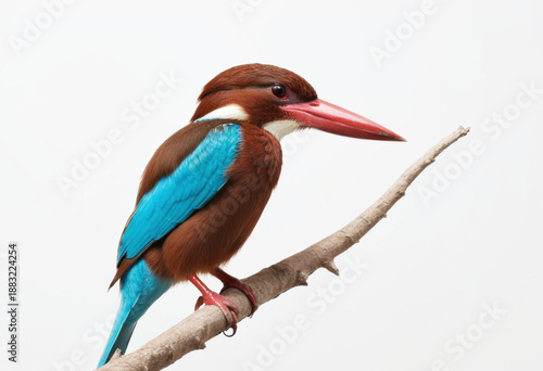 © Vic, Obraz premium White-throated Kingfisher, small bird with massive red beak, perched on a branch, on white background