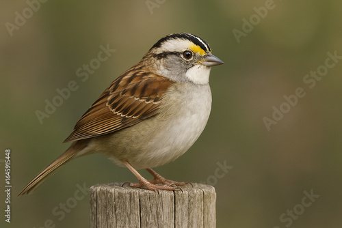 © Masud, Fototapeta premium White throated sparrow perched on a wooden post in soft light