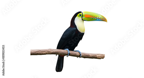 Naklejka premium White throated Toucan, perched on a wooden branch with a vibrant multicolored beak, isolated on a white or transparent background, cutout, PNG