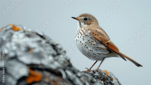Fototapeta premium White Thrush Zoothera Aurea Camouflaged in Tiger Pattern Feathers on Old...