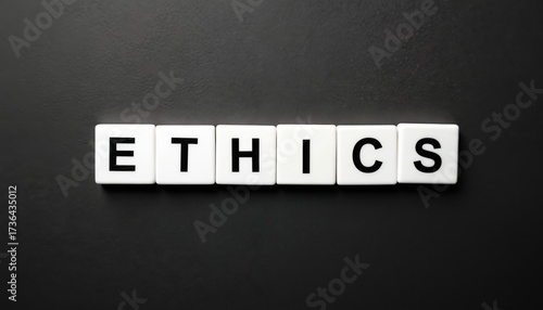 © miss irine, Obraz premium White tiles spell out the word ETHICS in black letters against a dark textured background. Simple clean concept for moral or professional standards.