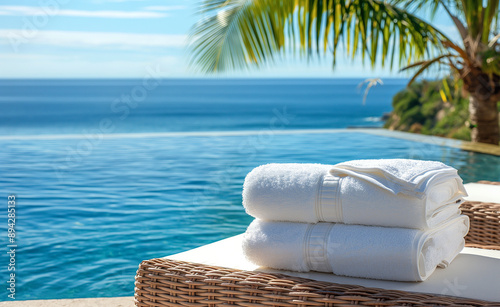 Obraz premium White towels neatly folded on a poolside lounger with a tropical ocean view.
