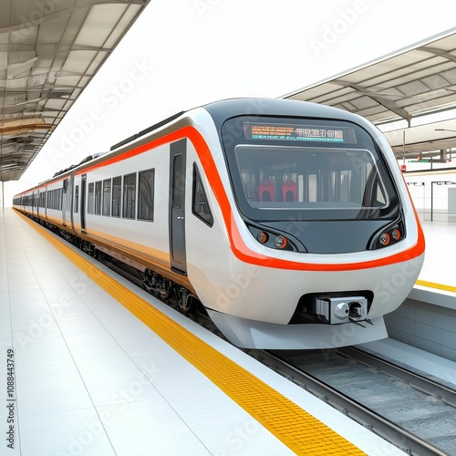 © jambulart, Naklejka premium White train at a platform with yellow stripes.